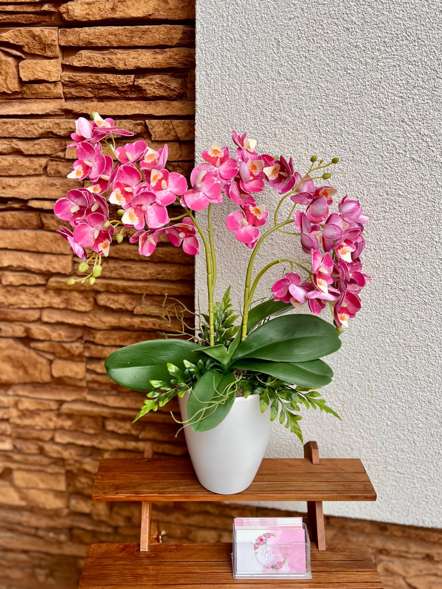 Fehér színű kerámia kaspóba készült, 2 ágas pink színű mű orchidea, izlandi zuzmóval.