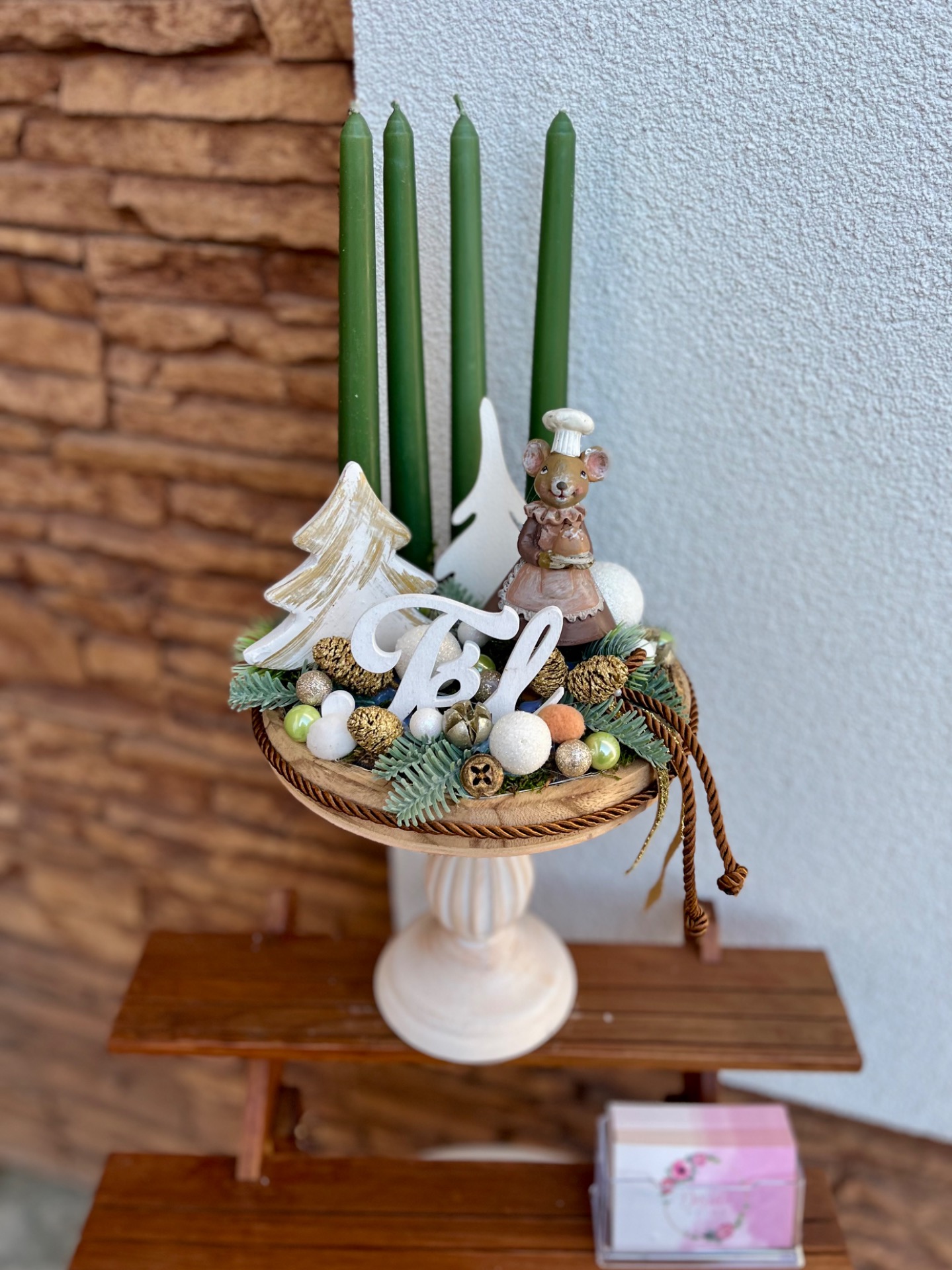 Sok-sok kiegészítővel készült adventi dísz fa alapra, led világítással.