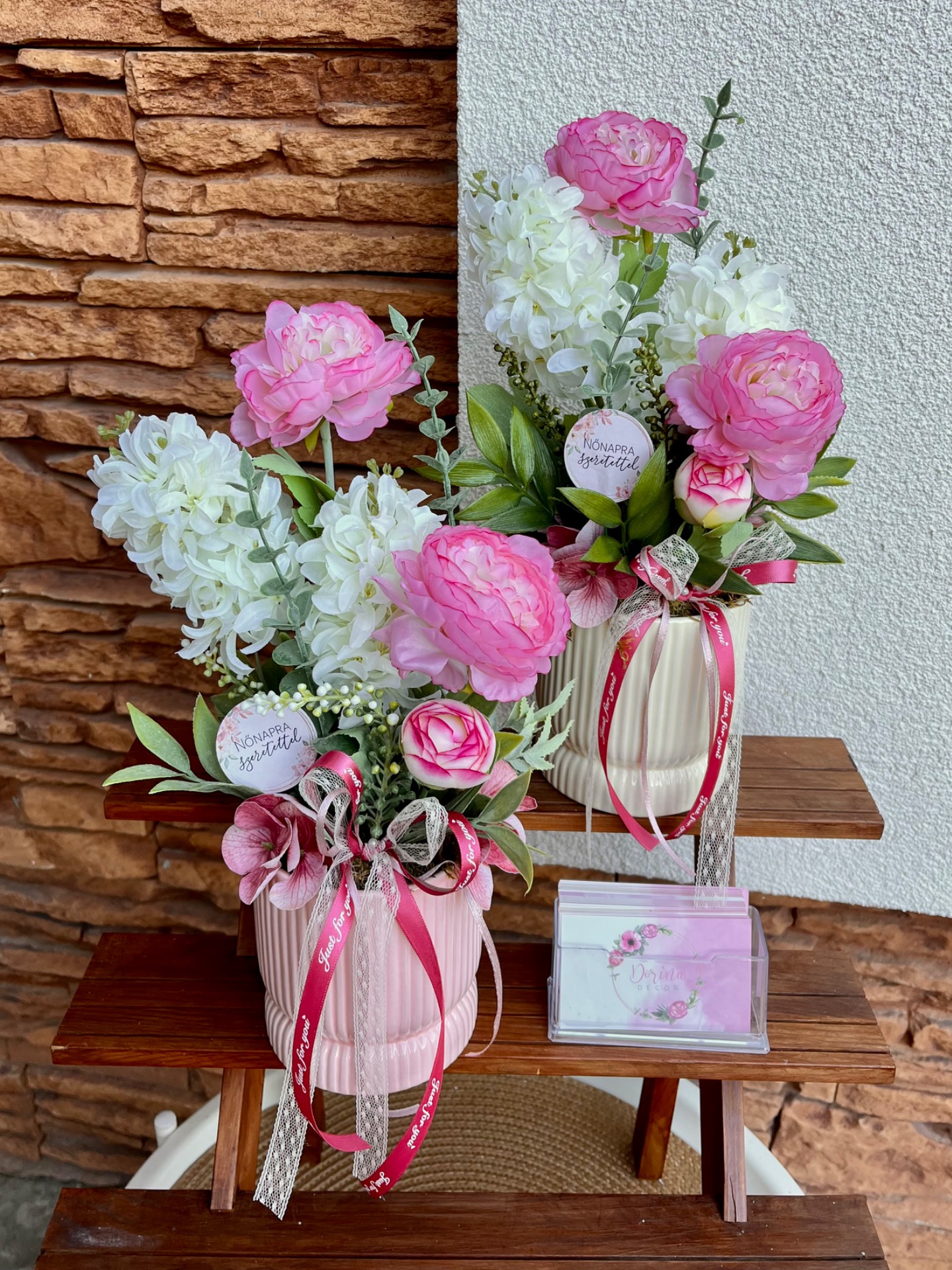 Nőnapi asztaldísz-mű peoniával és jácinttal-krém
