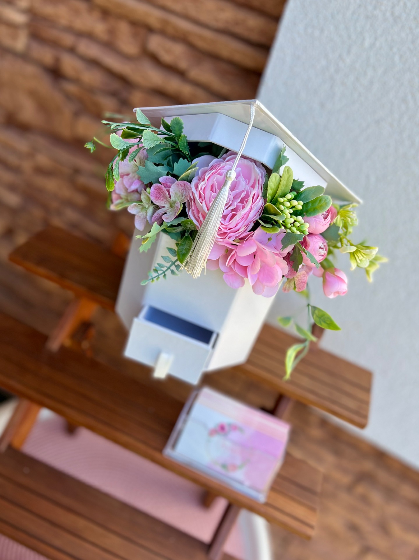 Művirág box, fiókkal, ahova pénzt esetleg egyéb ballagási ajándék elrejthető. Ballagásra vagy diplomaosztóra is tökéletes.