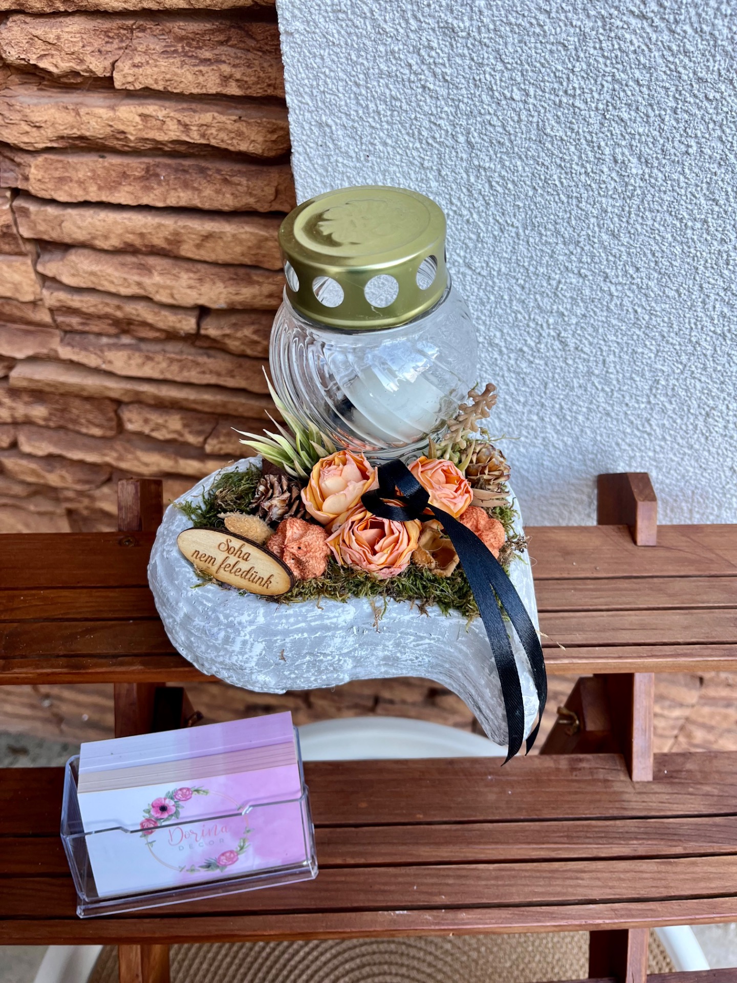 Beton szív alapra készült kegyeleti dísz művirágokkal és mécsessel.