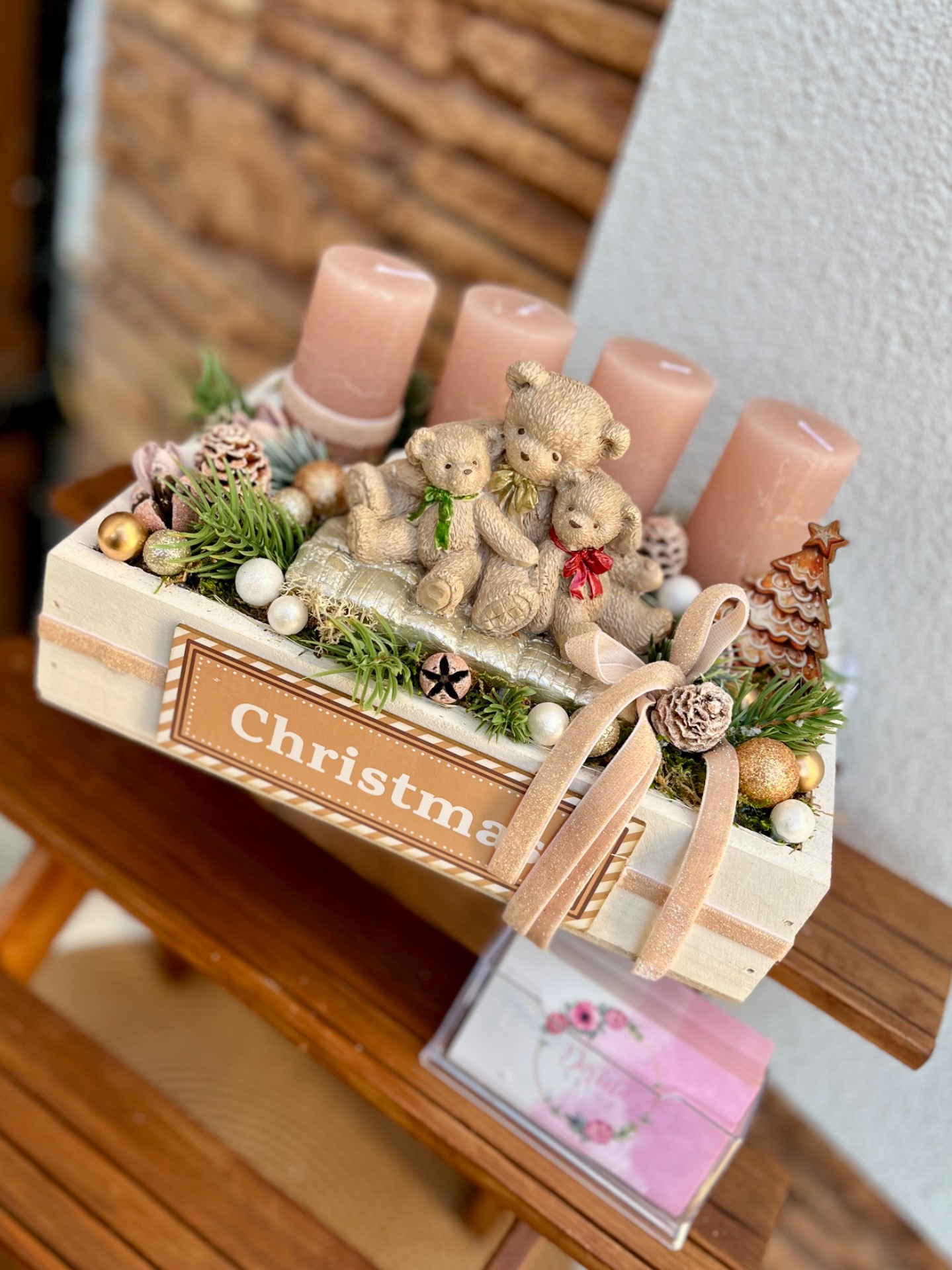 Sok-sok kiegészítővel készült Maci család adventi dísz fa alapra, led világítással.