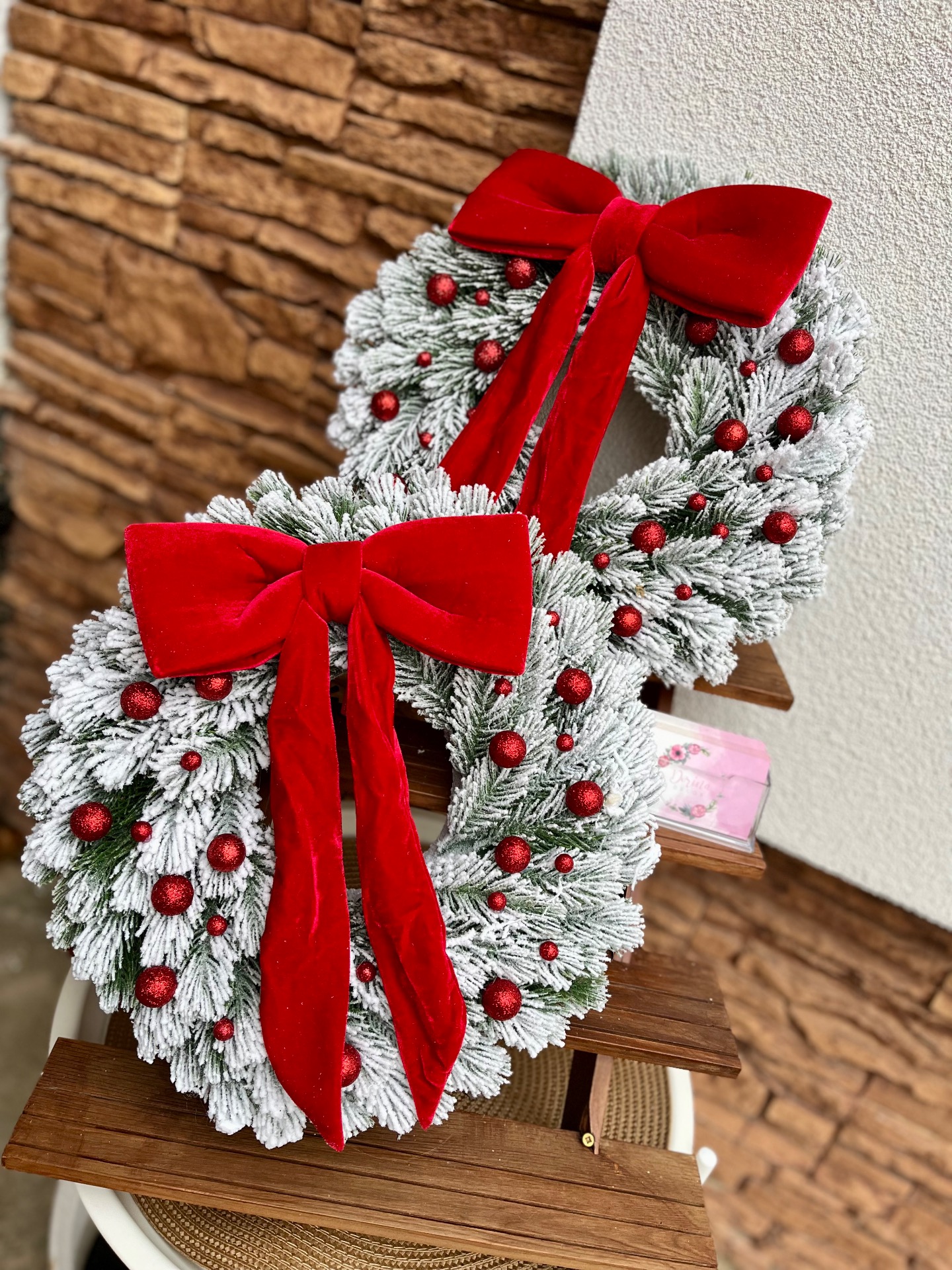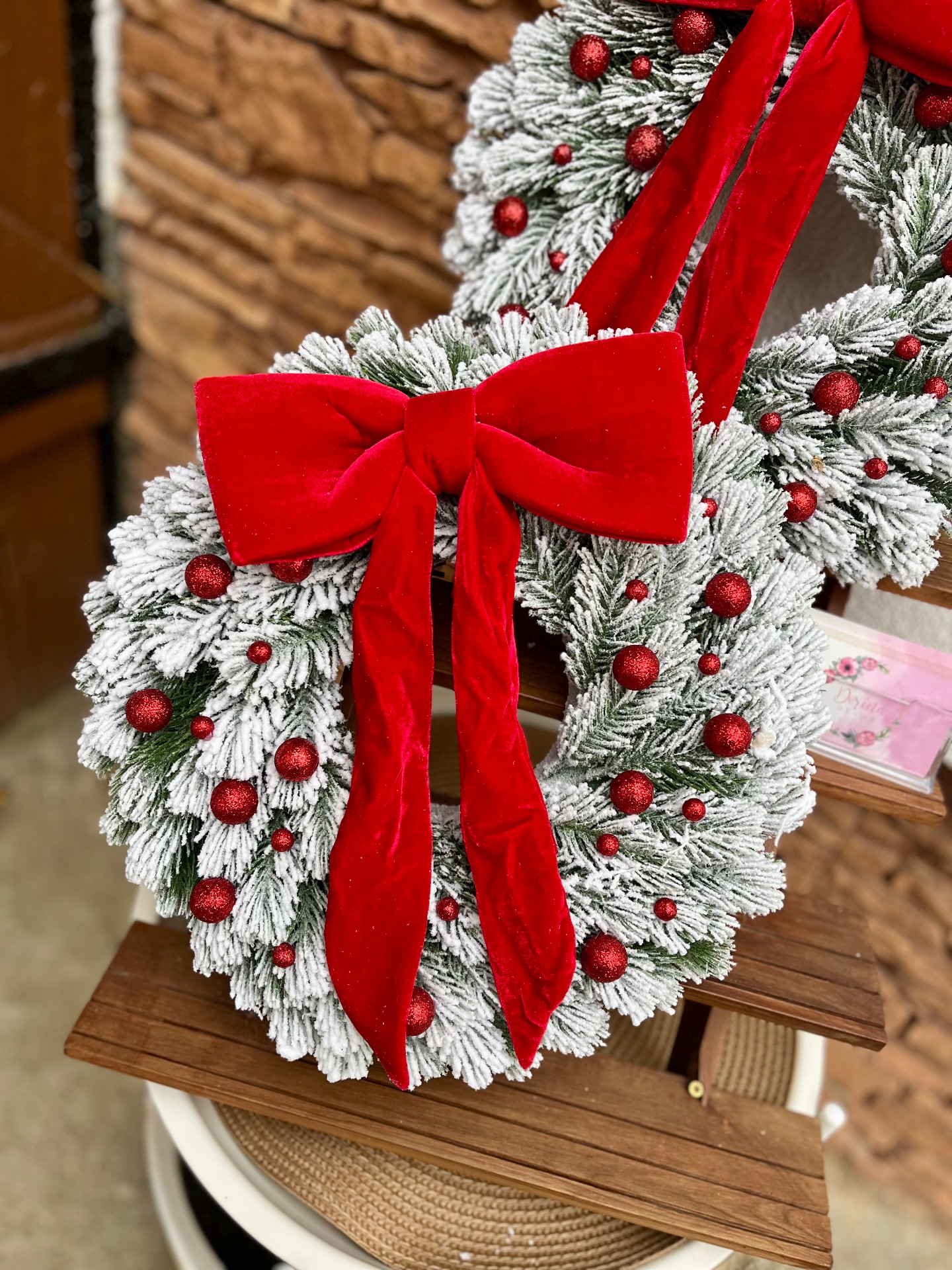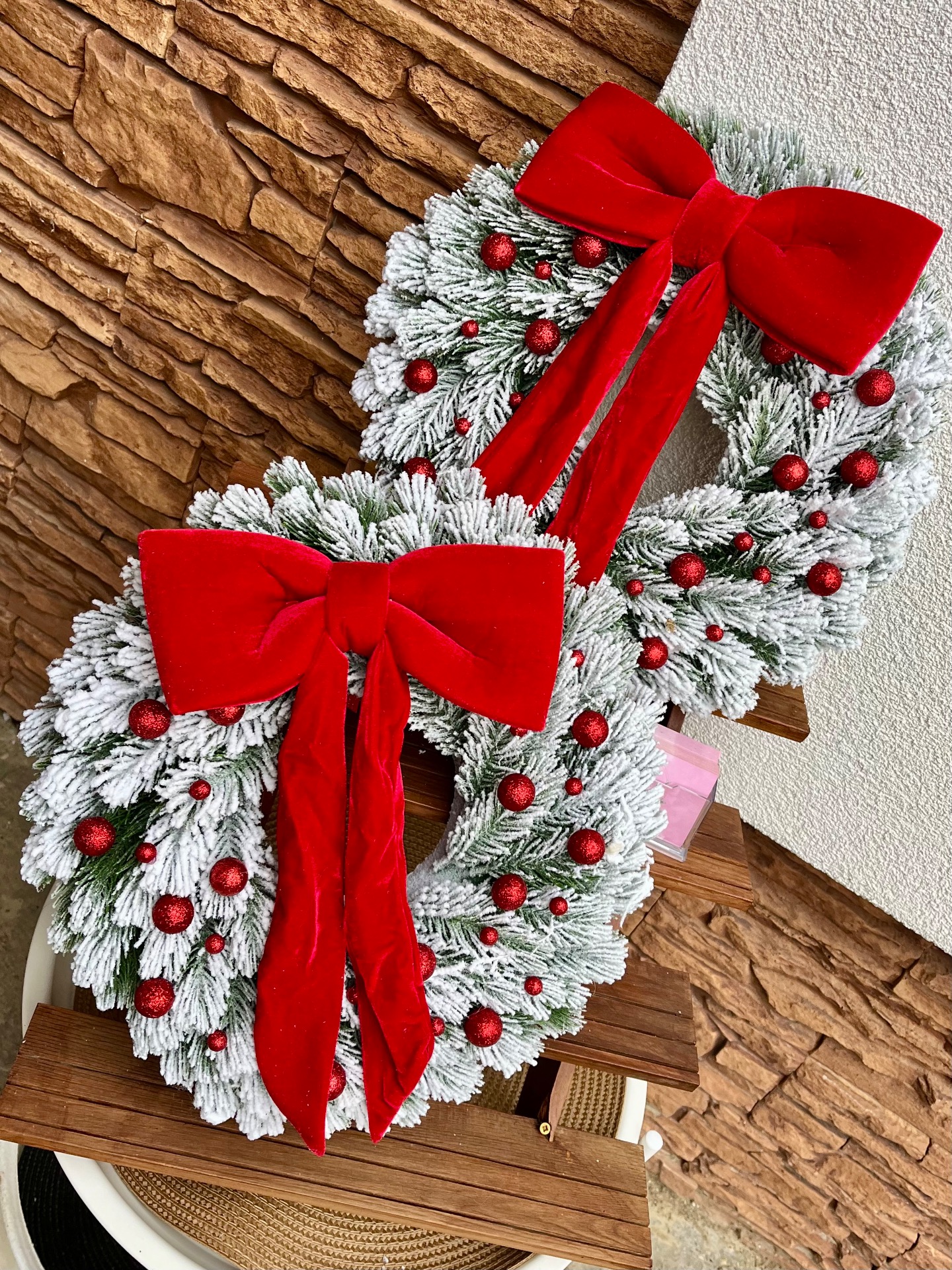 Élethű, havas műfenyő koszorú alapon (32 cm) plüss-bársony piros masni (20 cm). Ablakra, ajtóra vagy akár falra is tehető.
