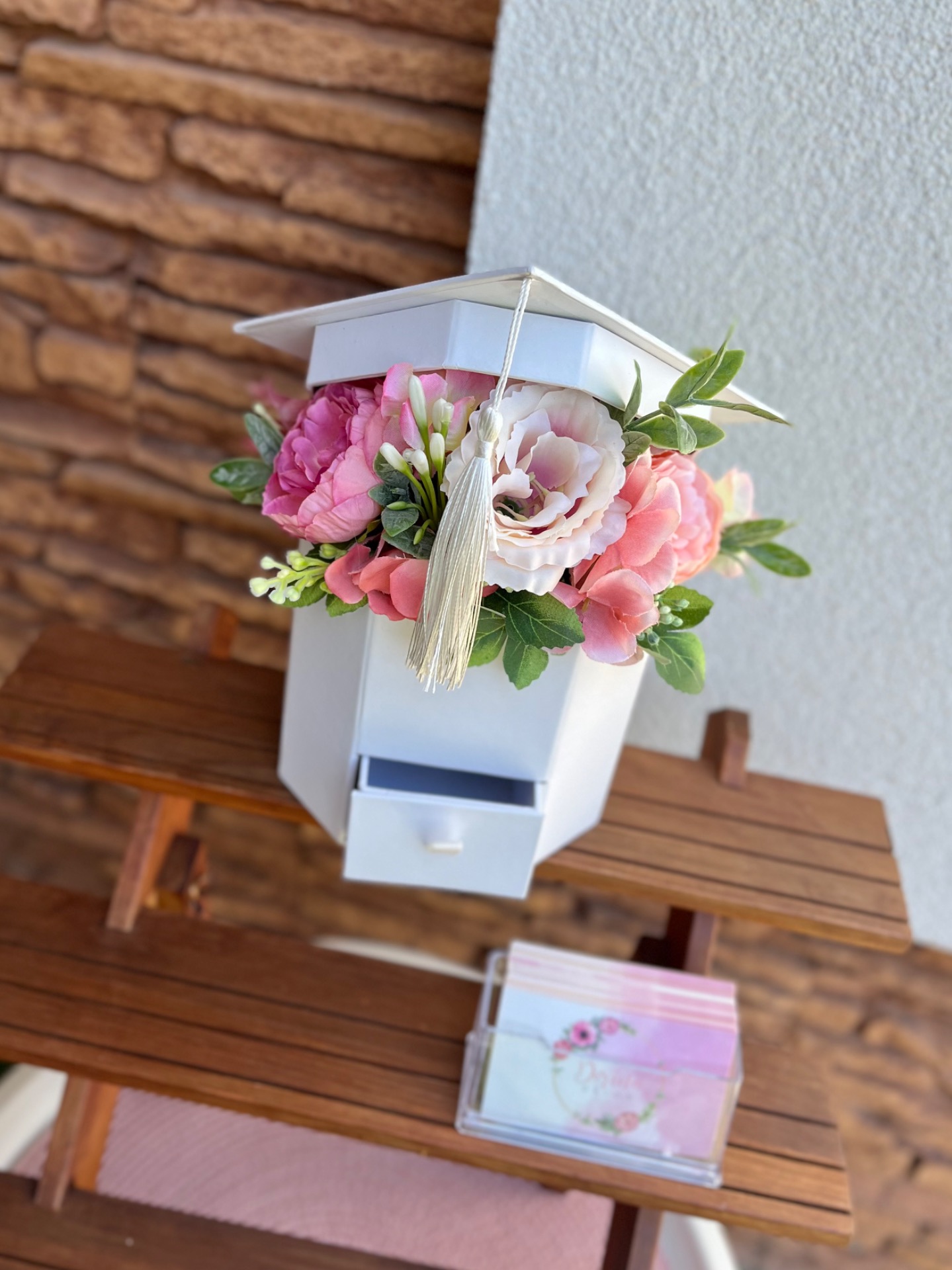 Művirág box, fiókkal, ahova pénzt esetleg egyéb ballagási ajándék elrejthető. Ballagásra vagy diplomaosztóra is tökéletes.