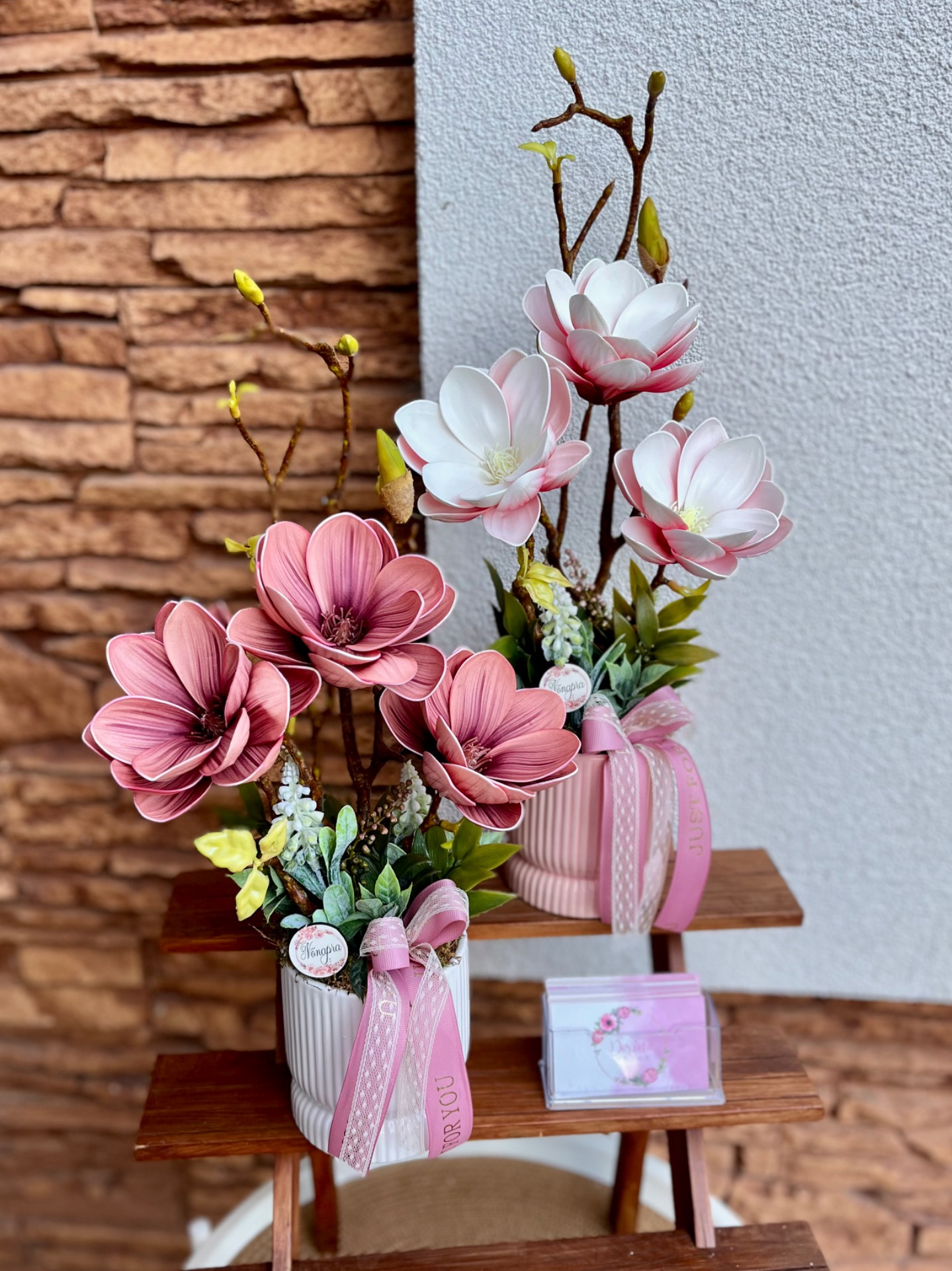 Élethű mű magnólia, 3 darab, egyenként ~10cm-es virággal. Szára tökéletes mása az igazinak, tövében natúr izlandi zuzmó található zöld kiegészítő levelekkel.