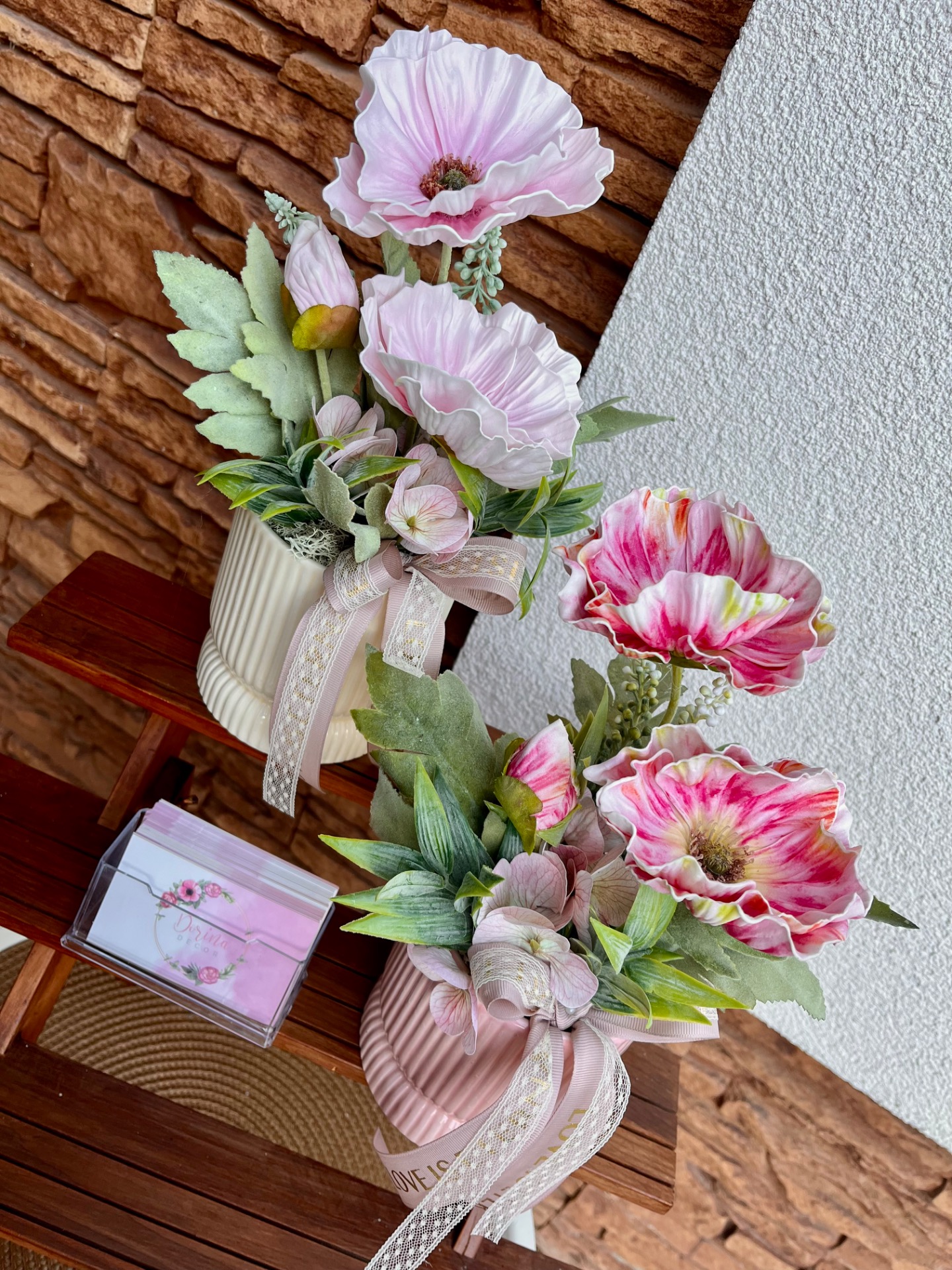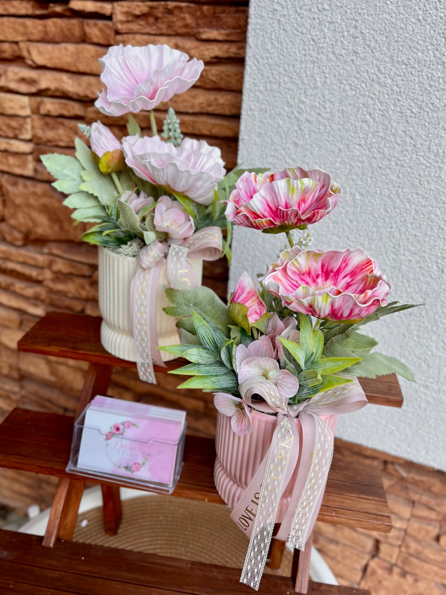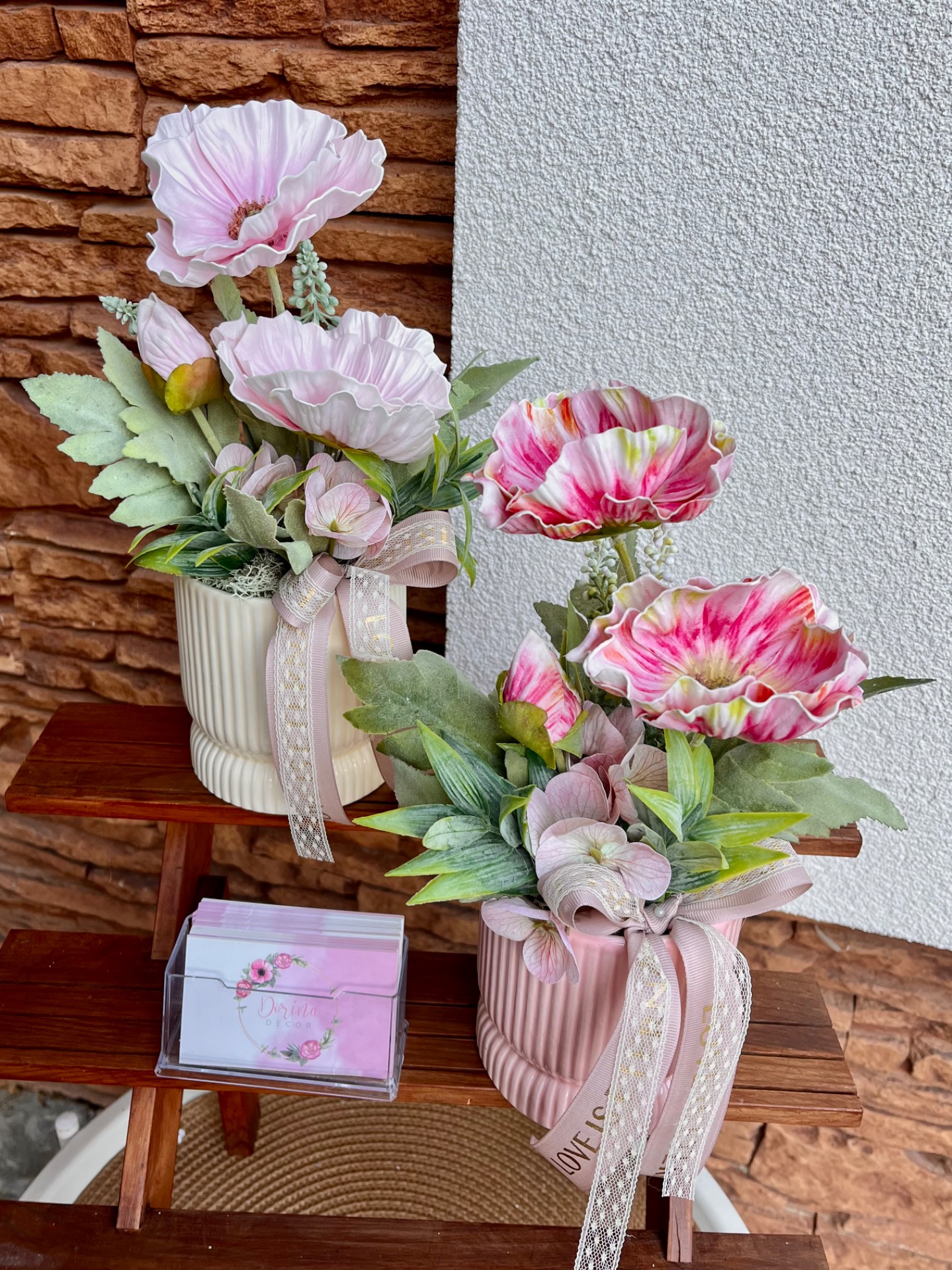 Csíkos kerámia kaspóba készült tavaszi asztaldísz sok művirág kiegészítővel. Plusz felirat is kérhető!
