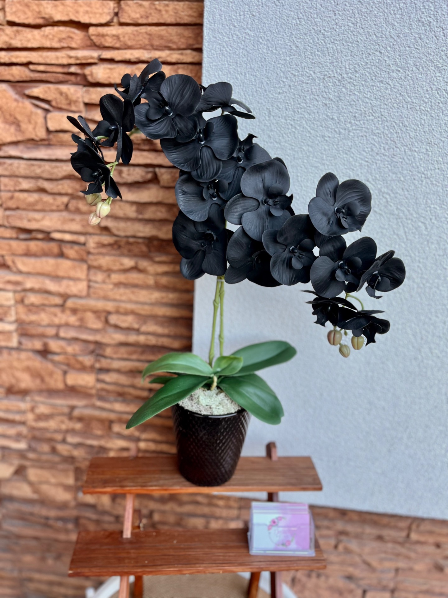 Fényes bronz színű kerámia kaspóba készült, 2 ágas fekete színű mű orchidea, izlandi zuzmóval.