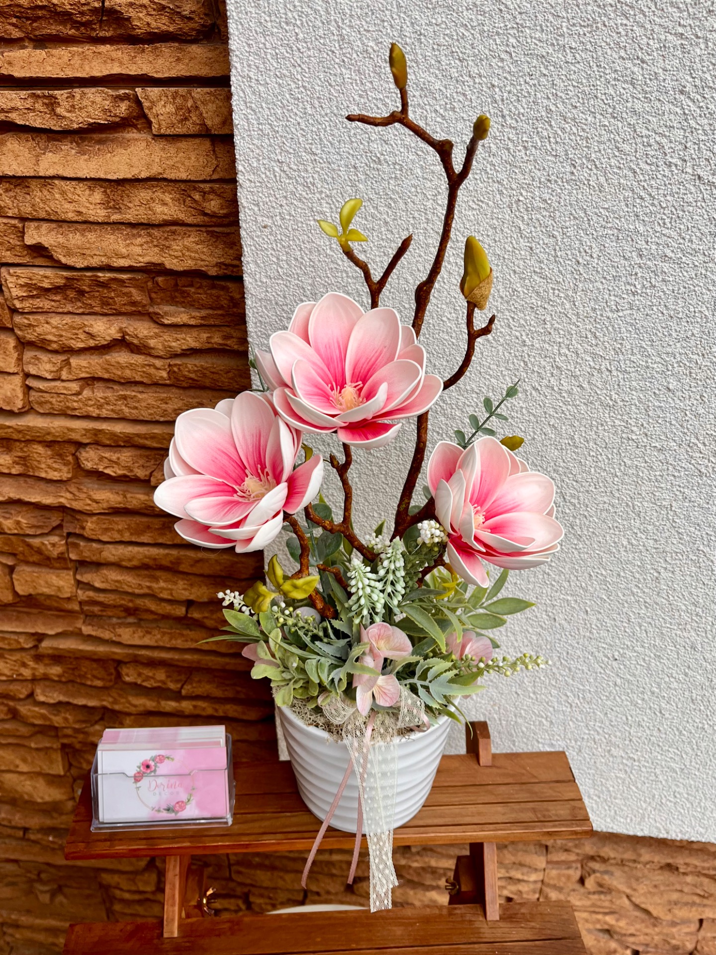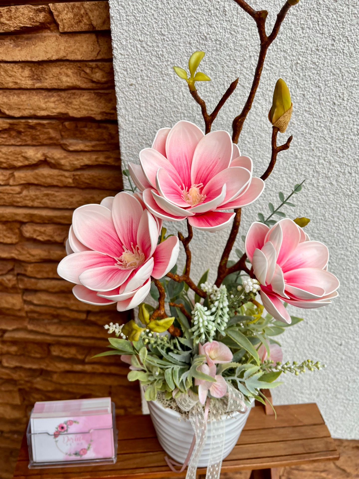 Élethű mű magnólia, 3 darab, egyenként ~10cm-es virággal. Szára tökéletes mása az igazinak, tövében natúr izlandi zuzmó található zöld kiegészítő levelekkel.