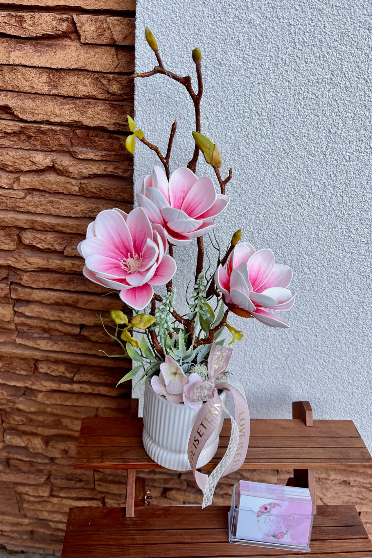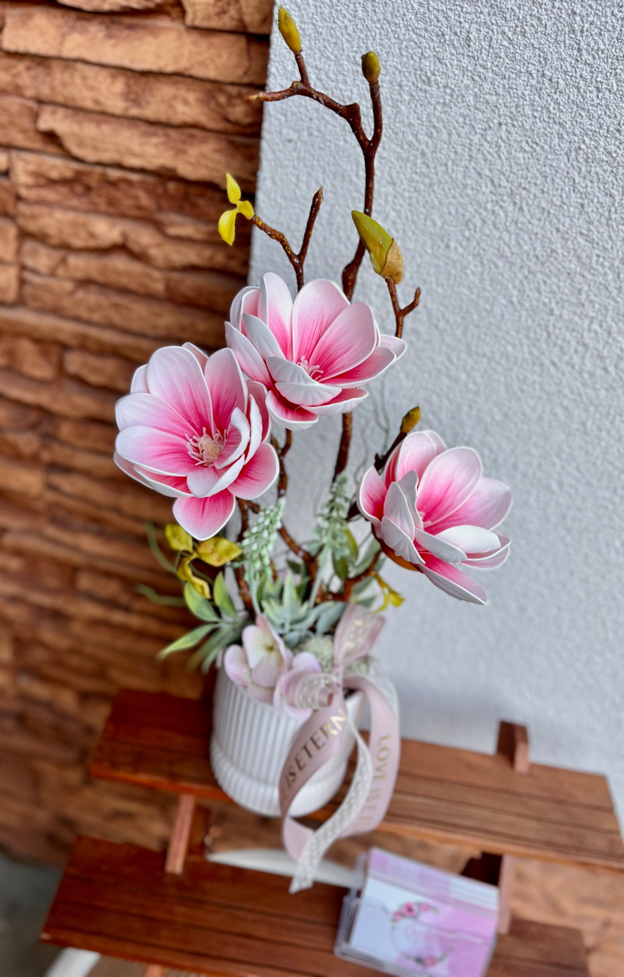 Élethű mű magnólia, 3 darab, egyenként ~10cm-es virággal. Szára tökéletes mása az igazinak, tövében natúr izlandi zuzmó található zöld kiegészítő levelekkel. Kaspó mérete: 10x12 cm