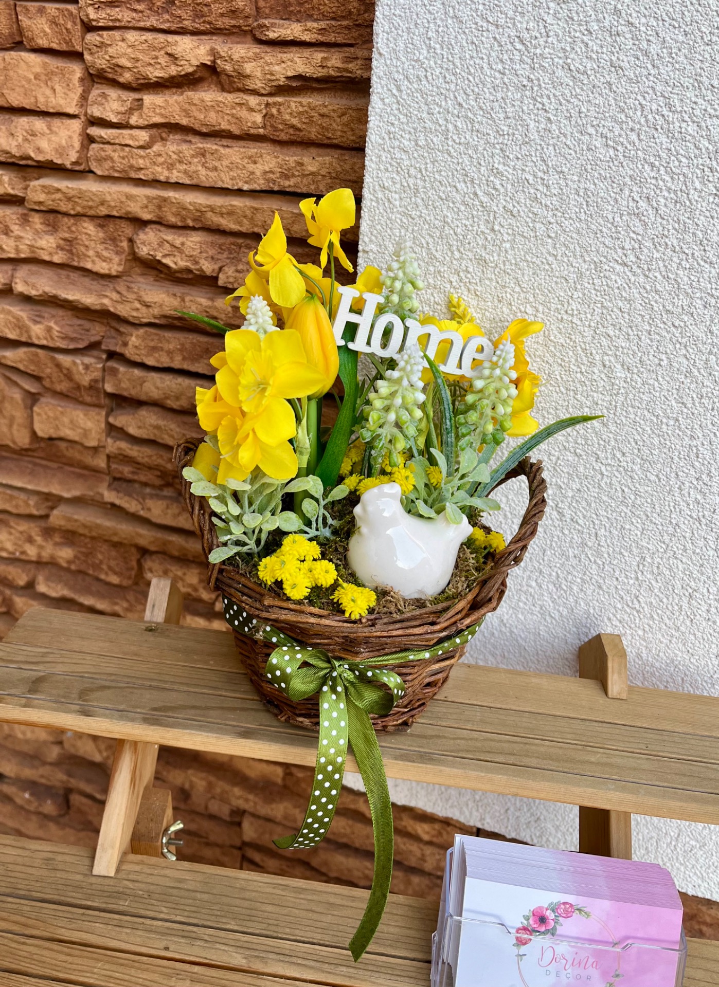 Vessző kosárkába készült tavaszi asztal dekoráció élethű nárciszokkal és sok művirág kiegészítővel.