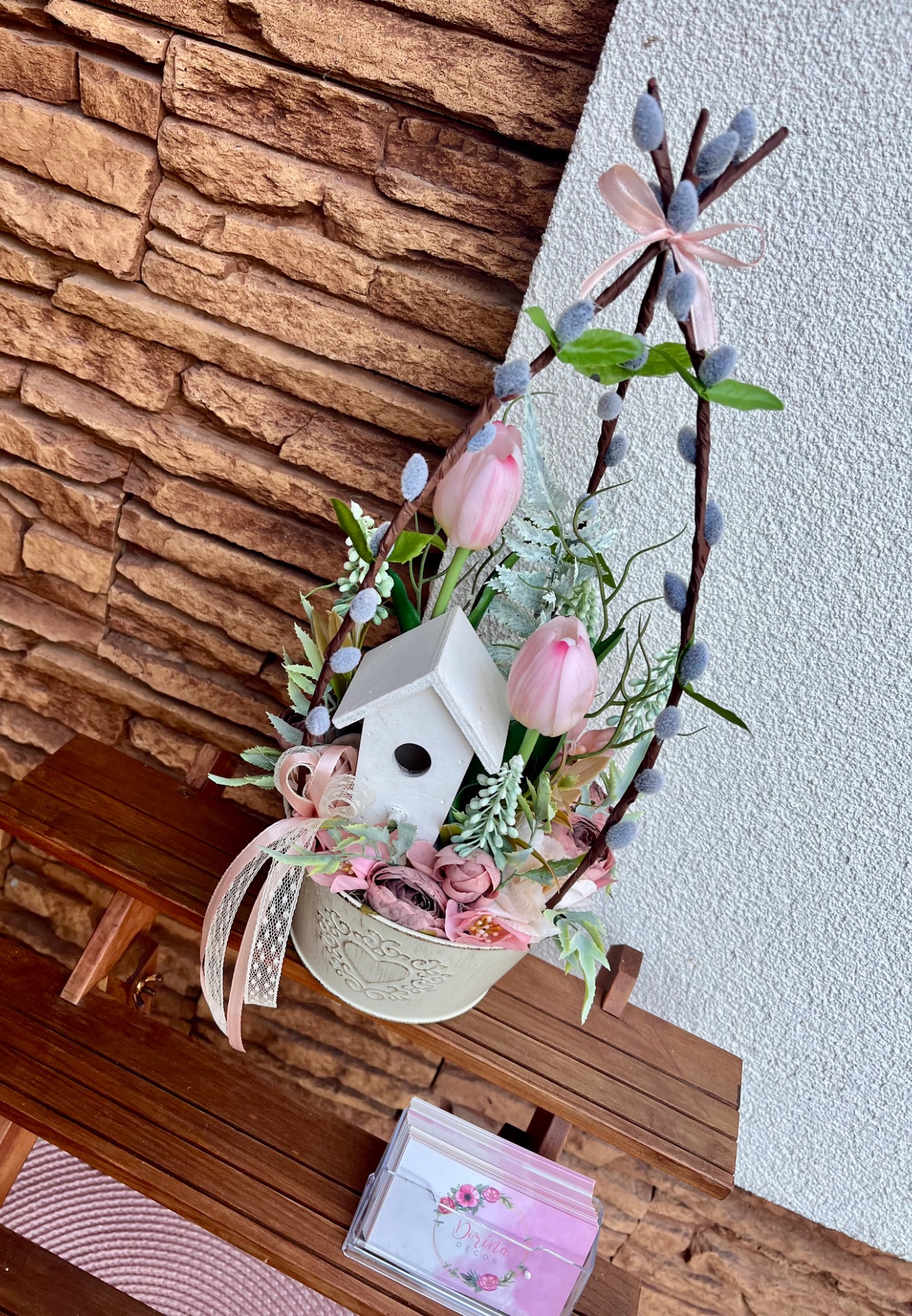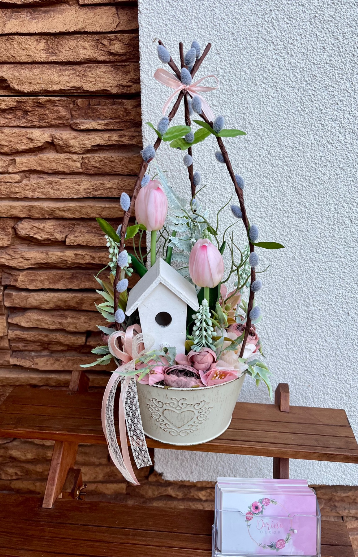 Teljesen élethű gumitulipánokkal, művirágokkal, madár házikóval és mű barkával.