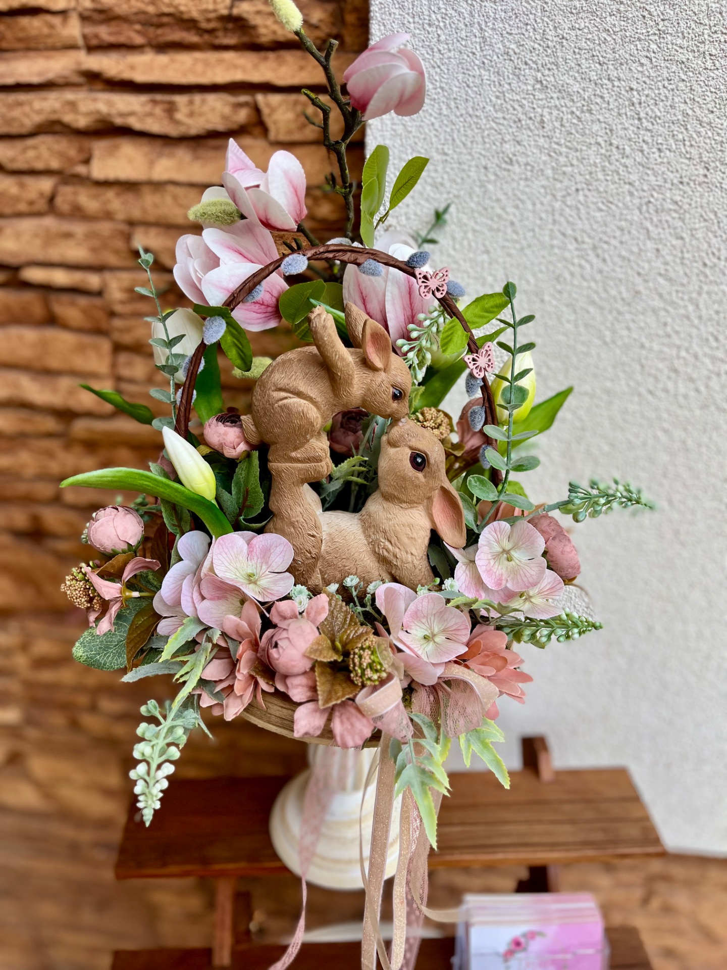 Teljesen élethű gumitulipánokkal, művirágokkal, mű barkával és magnólia ággal.
