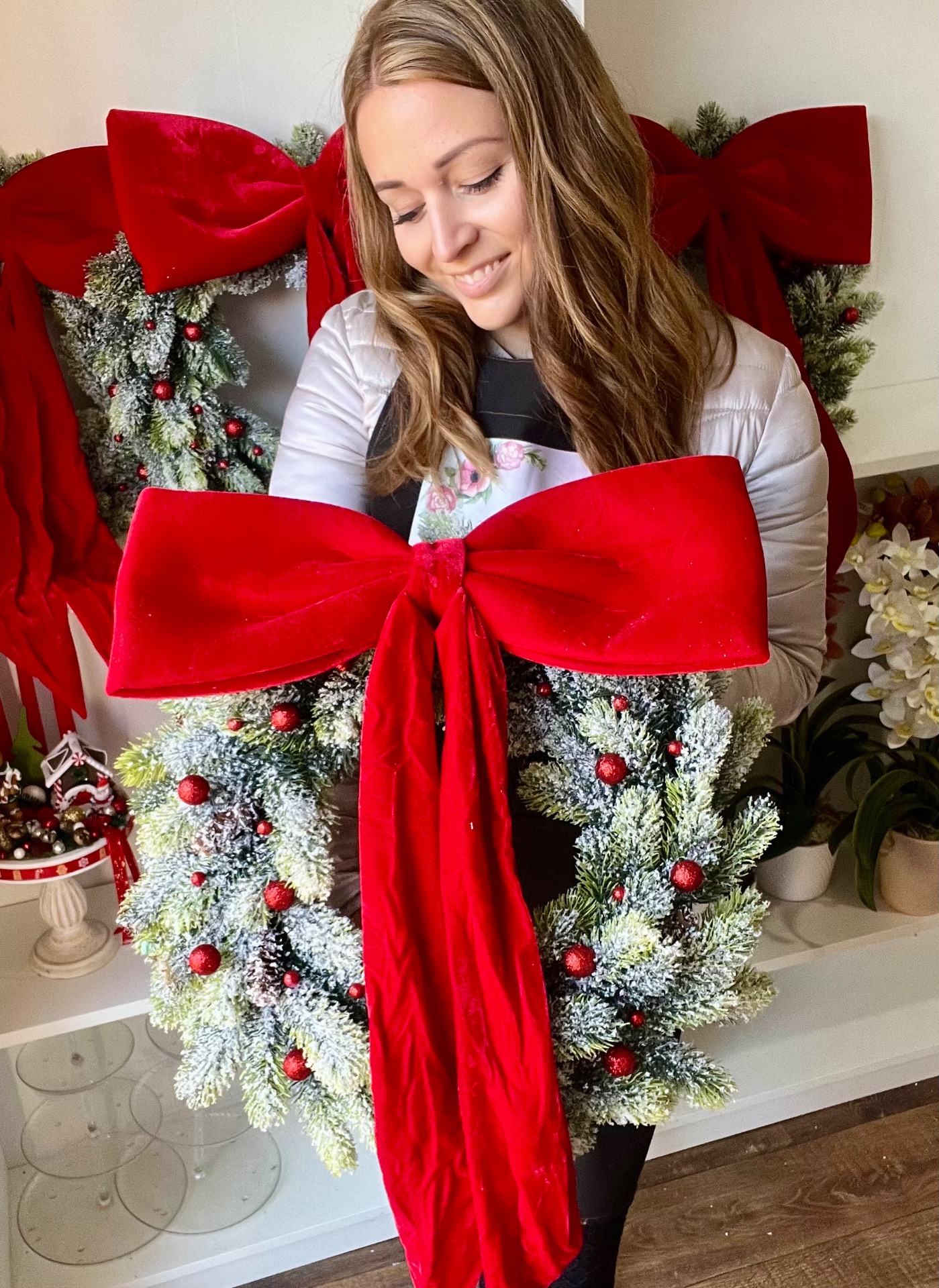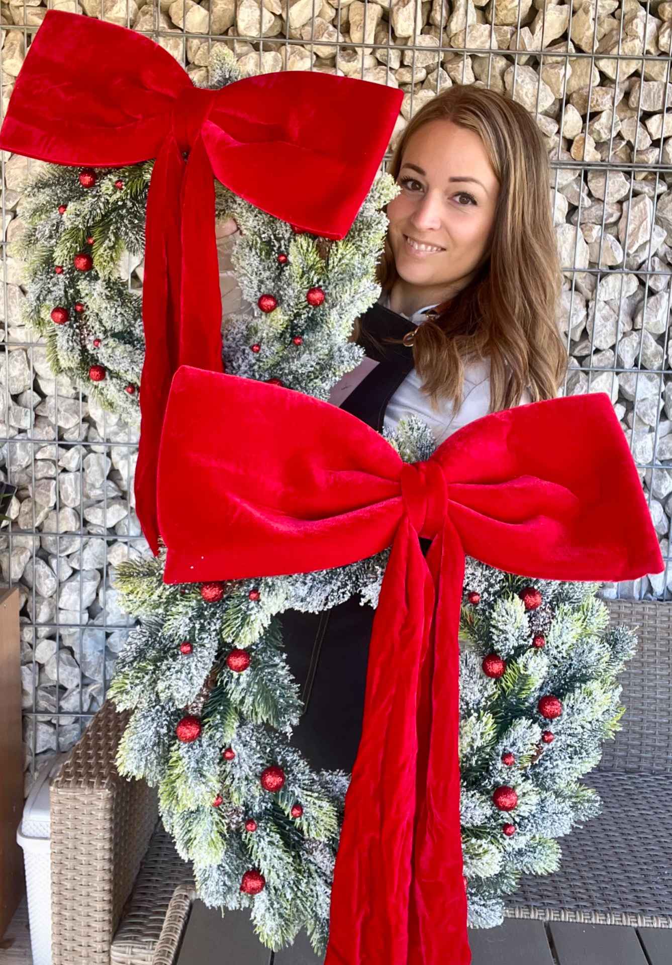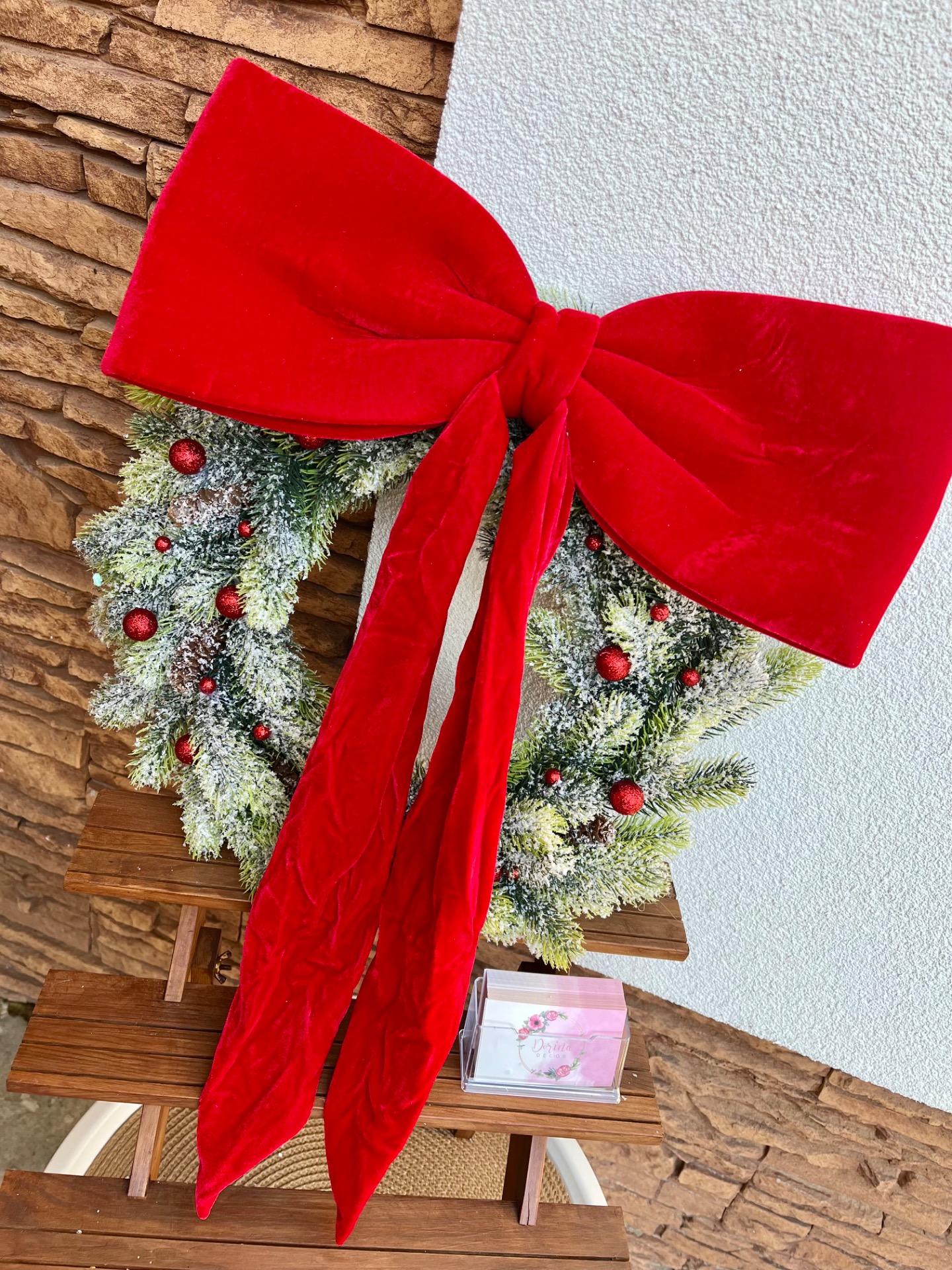 Élethű, havas műfenyő koszorú alapon (45 cm) plüss-bársony piros masni (40x60 cm). Ablakra, ajtóra vagy akár falra is tehető.